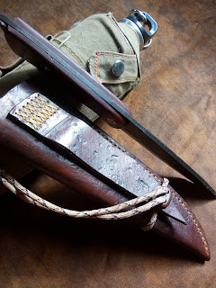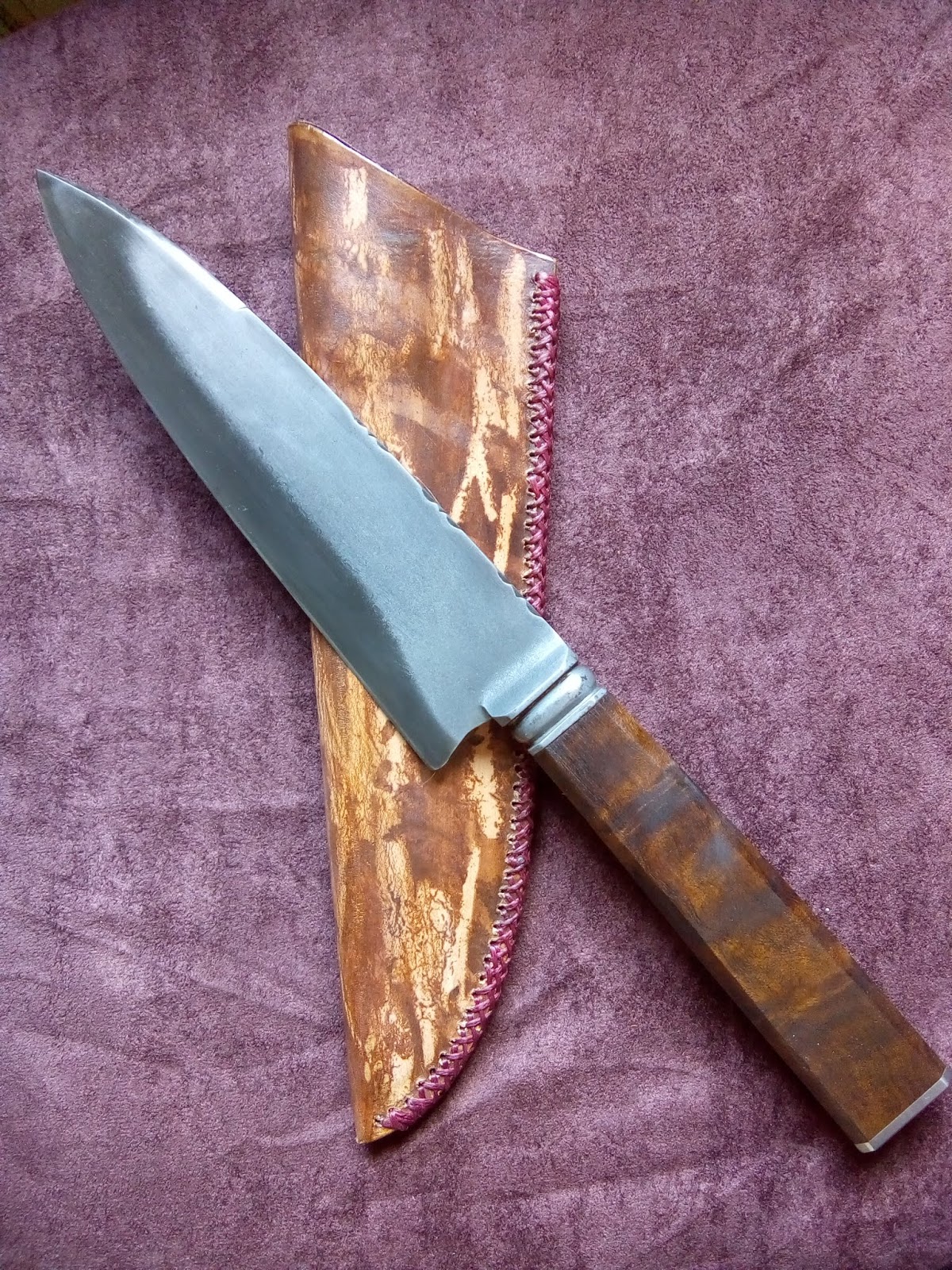 Faca Gaúcha forjada a partir de uma mola helicoidal (aço provável 5160), estrutura integral "full tang", com tempera seletiva e desbaste "full flat". Empunhadura em chifre de cervo. Dimensões: Comp. total 322mm; lâmina 205mm; largura máxima 40mm; empunhadura 115mm; espessura 4mm com "distal taper". Bainha em couro bovino tingido e forrado, costura manual com fio de nylon encerado. Decoração com estampos caseiros.